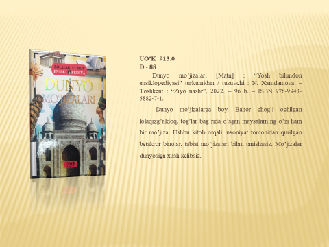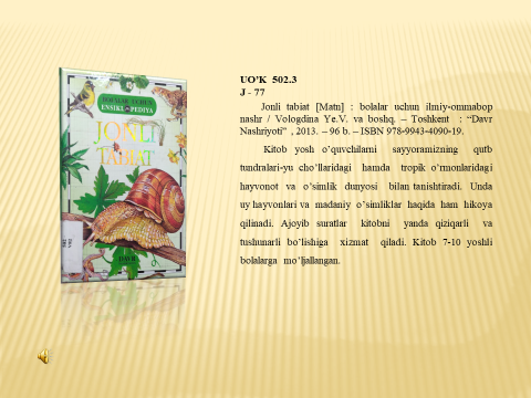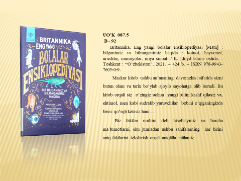 To’xtabayev, X. Donishmandbobo ertaklari [Matn] : ertaklar / birinchi qism/ X. To’xtabaye / ikkinchichi nashri. – Toshkent: Cho’lpon nomidagi NMIU, 2019. – 92 b. ISBN 978-9943-5380-6-1