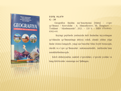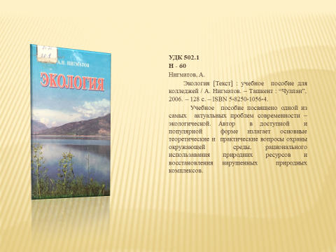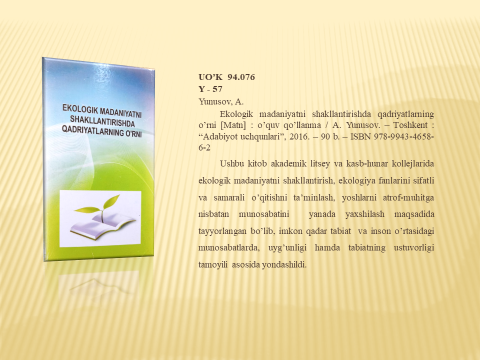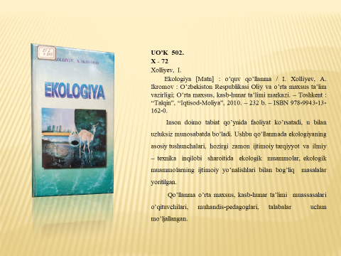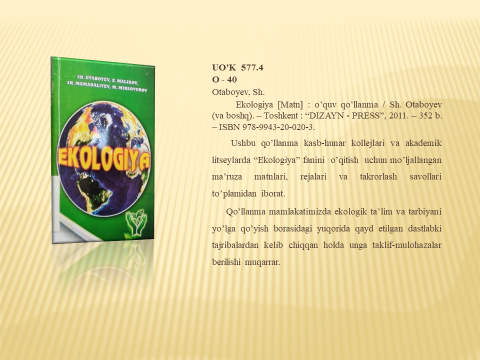 Ёш деҳқон энциклопедияси [Матн] : энциклопедия / С. Холназаров. – Тошкент : “O’zbekiston milliy ensiklopediyasi” Давлат илмий нашриёти, 2019. – 392 б. -ISBN 978-9943-07-697-6
