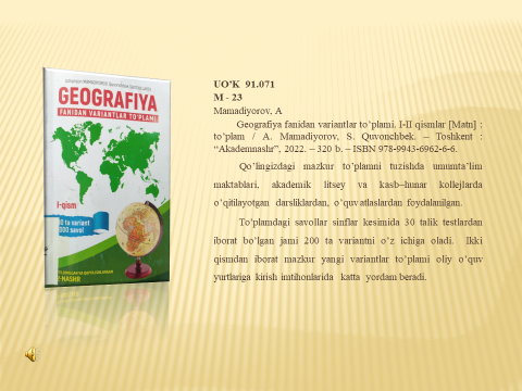 Toshkent : O’zbekiston milliy ensiklopediyasi, 2011. – 368 b.