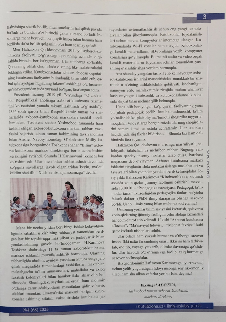 Yashnobod tuman axborot-kutubxona markazi direktori
