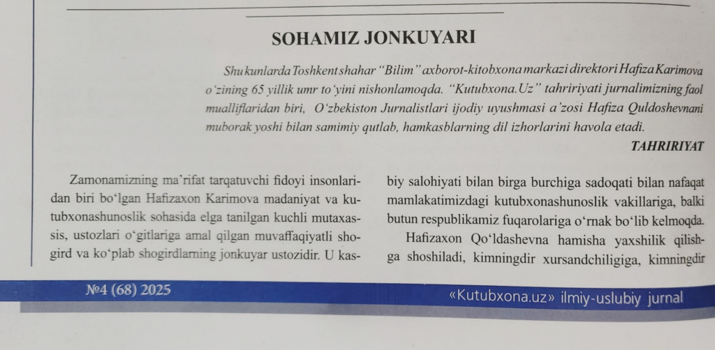 Aholi, ayniqsa, yoshlarimiz o‘qishga yoki ishga shoshilar ekan, yo‘l- yo‘lakay saytimizning QR-kodi orqali o‘zlariga zarur adabiyotlami telefonlariga yuklab olmoqda. Bu, bir tomondan, yurtdoshlaritmizning vaqtini tejayotgan bo’lsa. ikkinchi tomondan, kitobxonlik va mutolaa imkoniyatlarini osonlashtirmoqda.