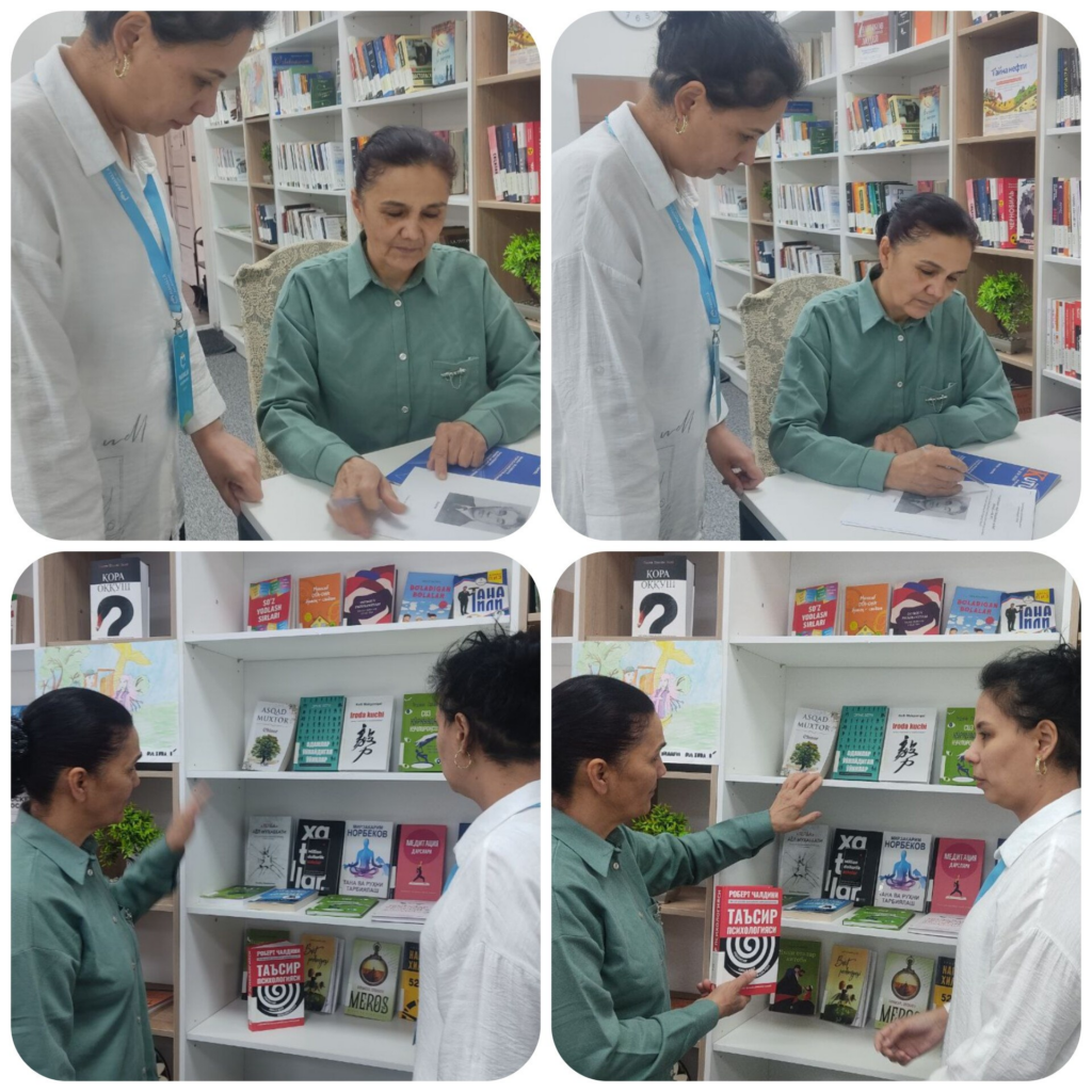 🔹Tashrif davomida mahalla kutubxonasida amalga oshirilgan ishlar holati o’rganilib, Axborot-bibliografiya xizmati tomonidan kutubxonada muhim sanalarga bag’ishlangan kitob ko’rgazmalari tashkil qilish, o’lkashunoslik mazmunidagi bibliografik qo’llanmalar tuzish bo’yicha amaliy va metodik yordamlar ko’rsatildi.